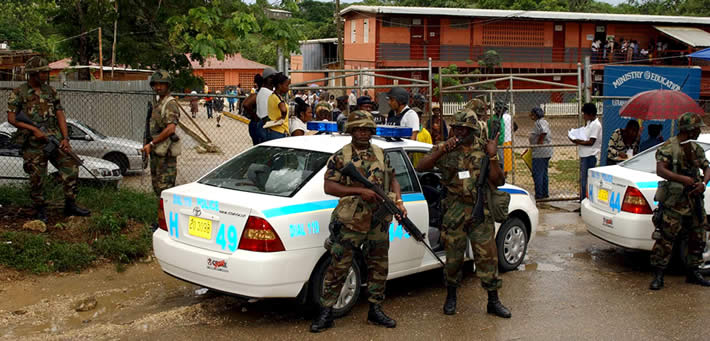 Members of the security force are captured here on full alert just outside the gates of the Flankers Primary and Junior High School.