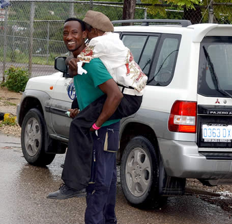 This elderly voter is being assisted 'donkey ride' by his young man as she join the list of voters in Flankers.